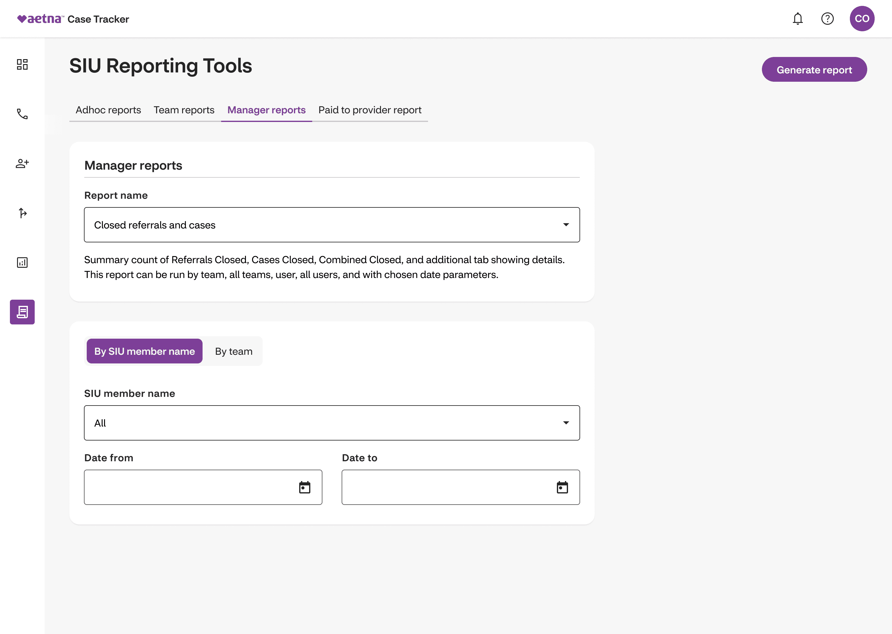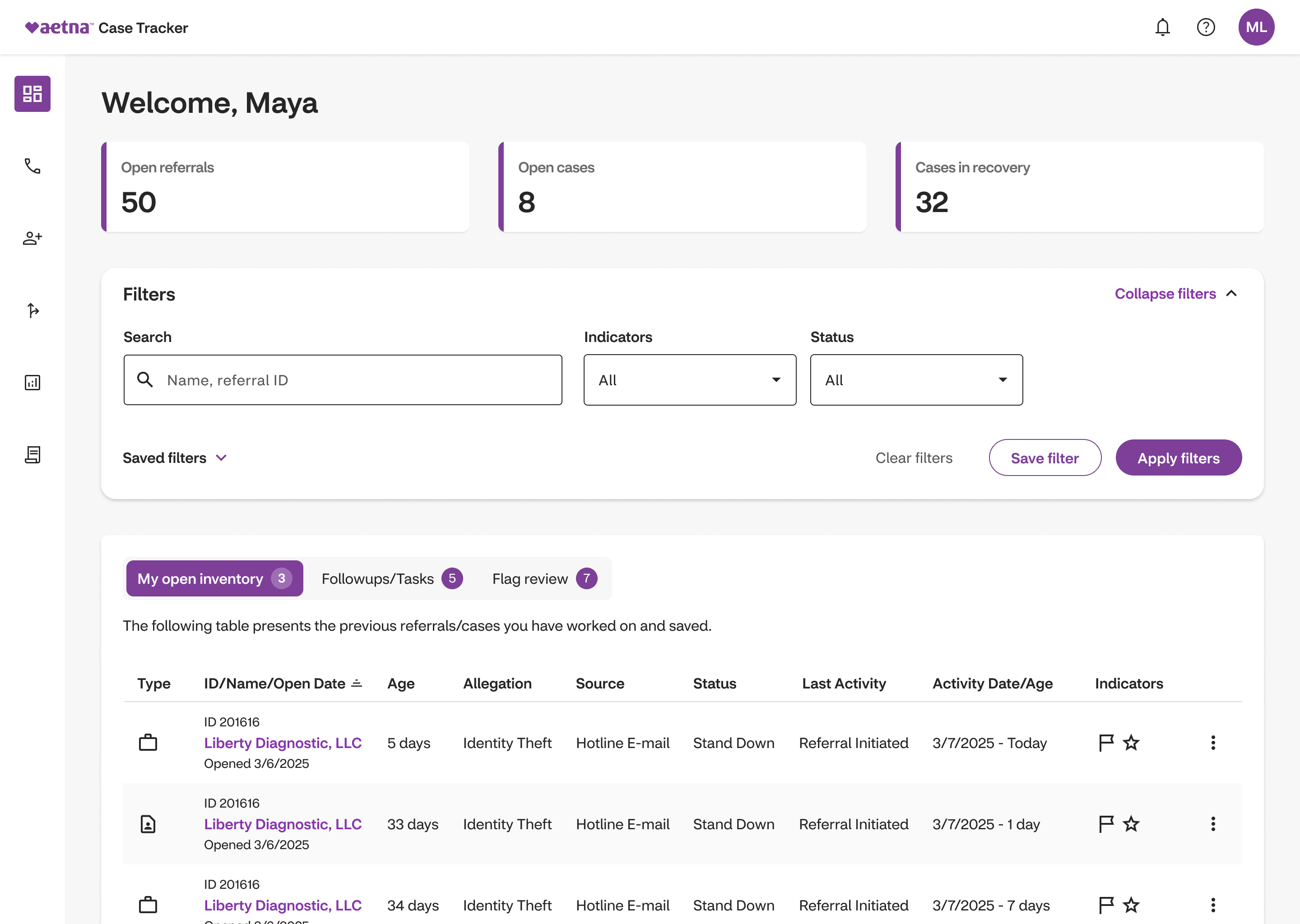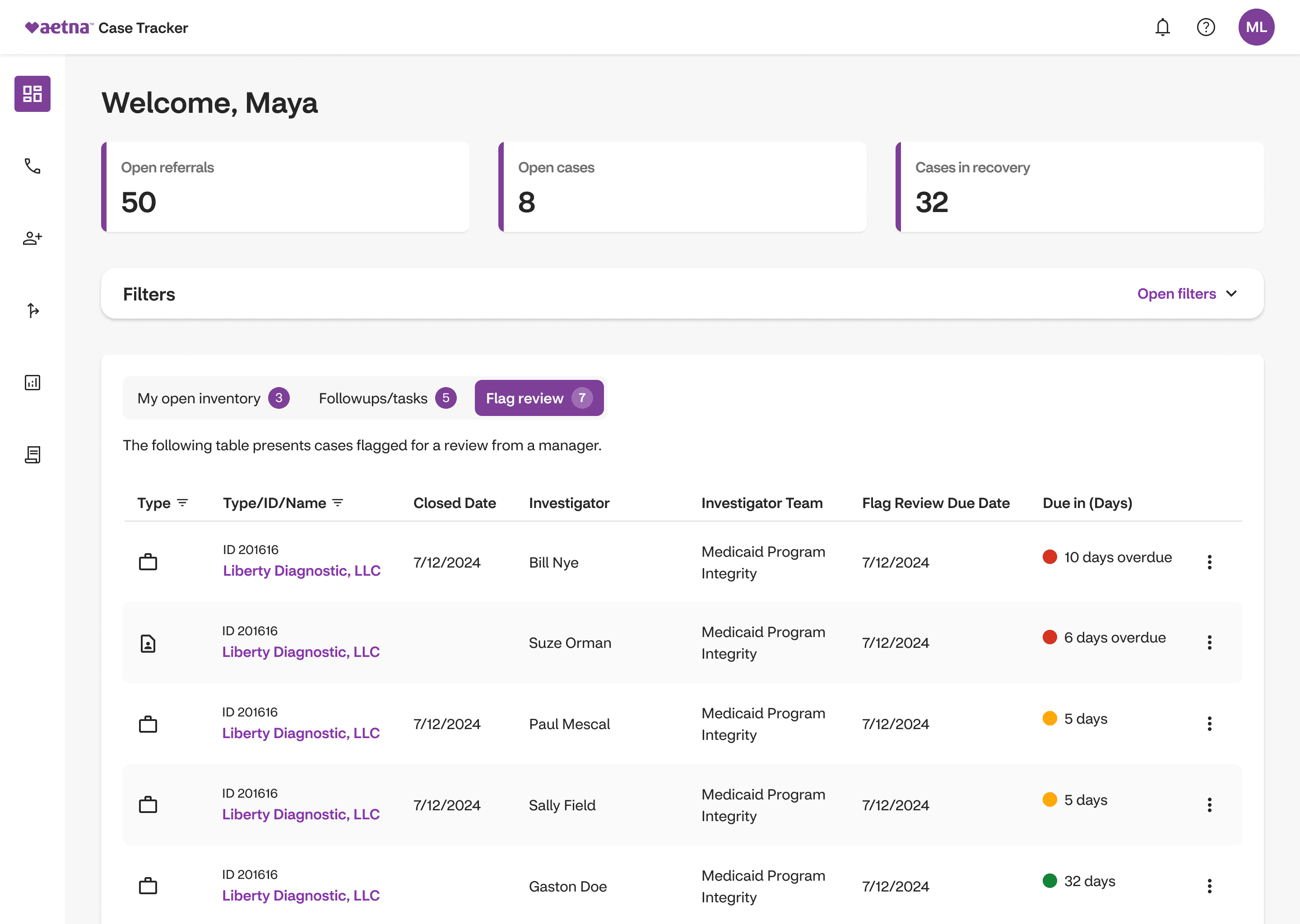 Managers now have their own space to help them keep track of their team. An interactive graph shows investigator's open cases. Easily track open referrals, cases in recovery, tasks and more.