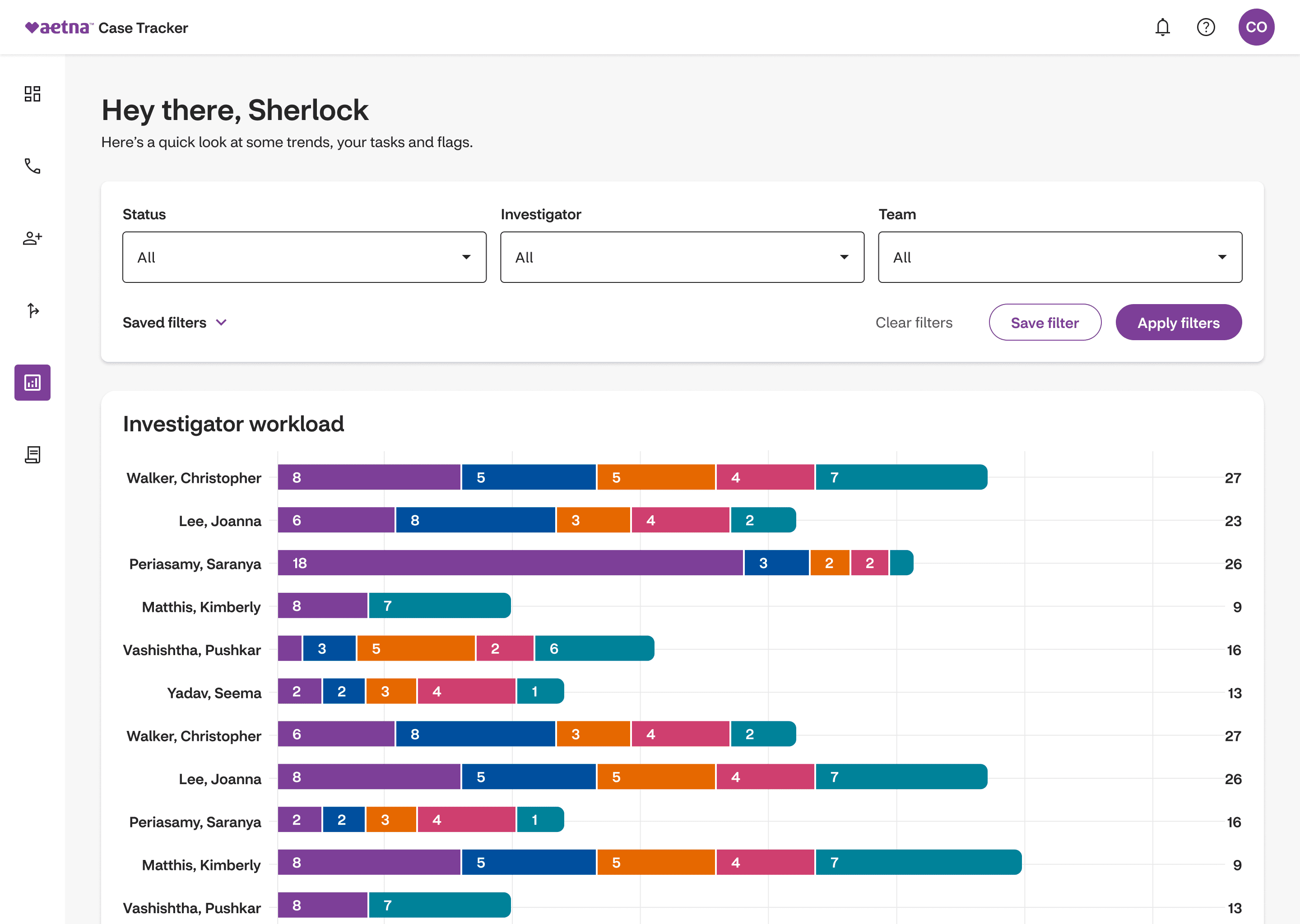 Managers oversee teams of investigators and their cases that total from thousands to millions in damages. There isn't a way currently to easily keep track of a team on investigator and all the cases.