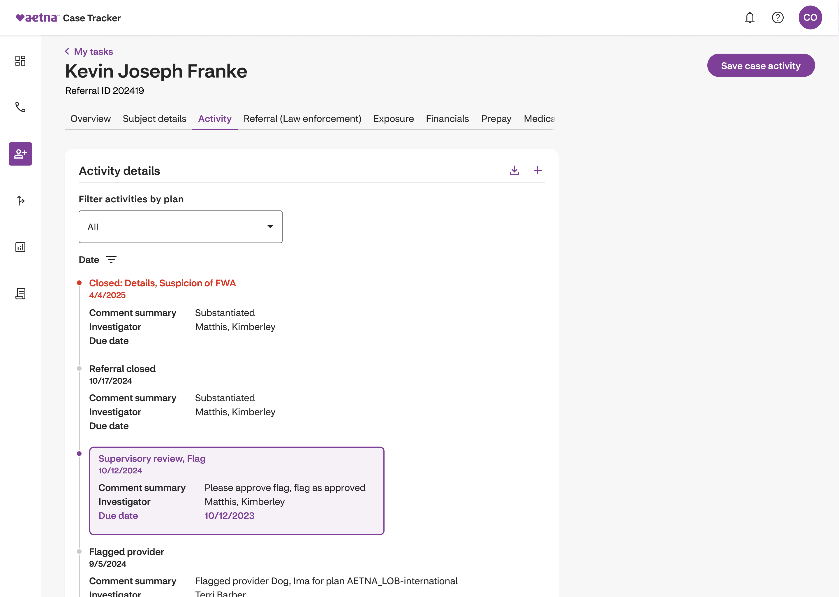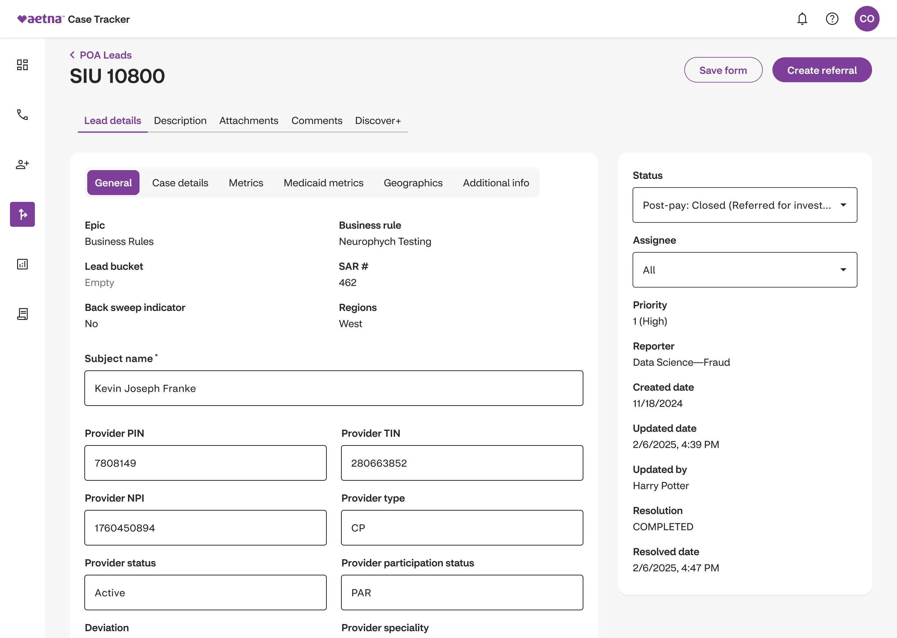 When Case Tracker believes a claim is potentially fraudulent, it automatically generates a lead. Investigators sift through the details of the lead to determine if it is a true lead or not. If true, they pick up the case weighing current workload and team initiatives.